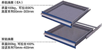 工具柜抽屉特殊滑轨设计,并用轴承滑动,载重进出轻盈顺畅.  单轨抽屉打开率90%,每层抽屉平均载重80-100kg. 双轨抽屉100%可打开,每层抽屉平均载重160-200kg.