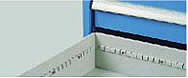 工具柜内全宽式把手设计,附PVC透明胶片及标示纸,对于产品分类存储,更具管理效果. 工具柜抽屉内可选择各种配件,弹性分隔空间,使各种工具存储皆能一目了然,不但可以保护工具,并能提高工作效率.